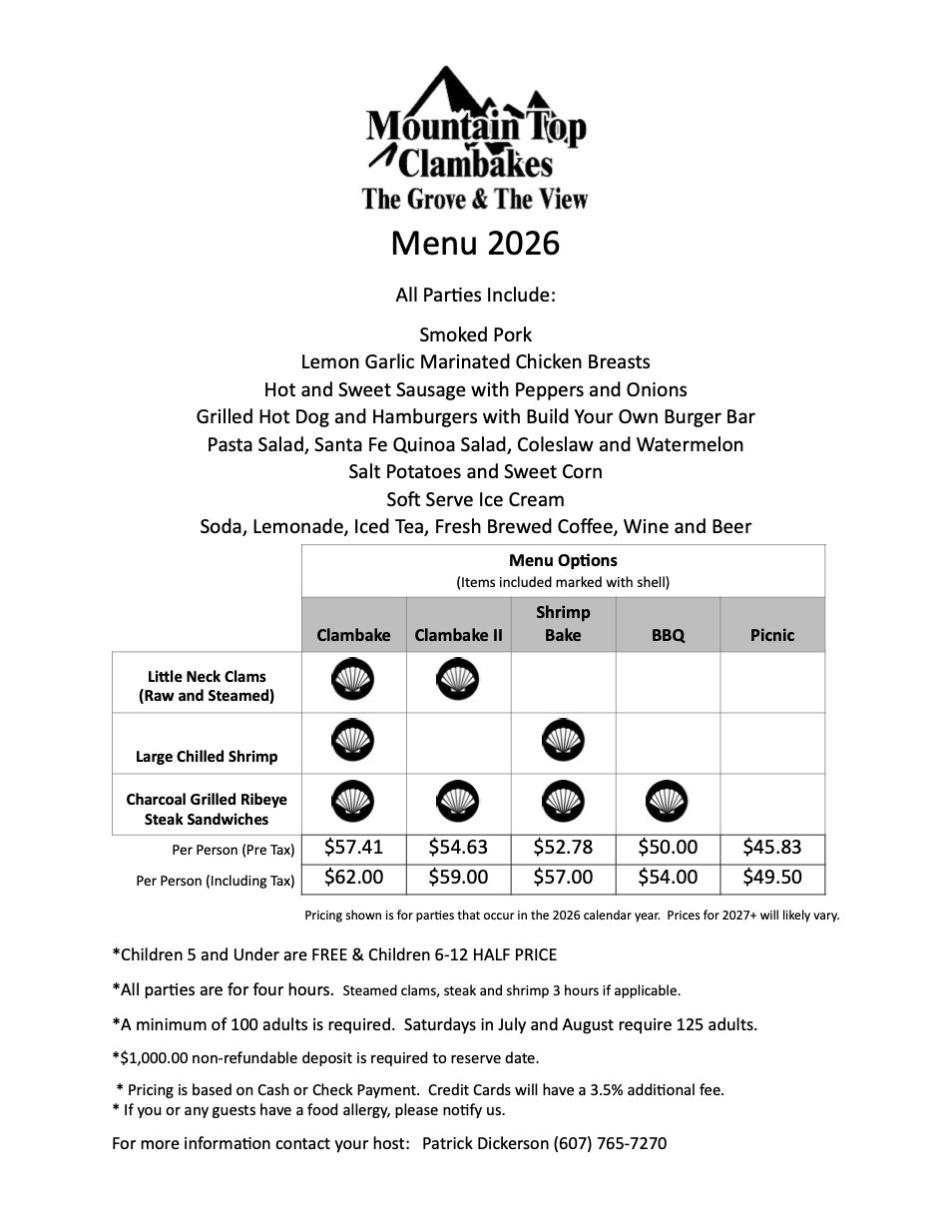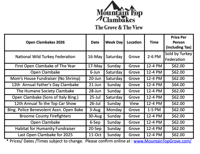 Since 1929 we’ve been at the top of enjoying summer in Broome County. The Dickerson’s have been perfecting the clambake recipe for two generations now. You can trust Patrick and Sarah to take care of your special day. You pick the date, menu, and any extra vendors, then we take care of the rest. This lets you enjoy your day and focus on making unforgettable memories! Bring your celebration to the Top with us!